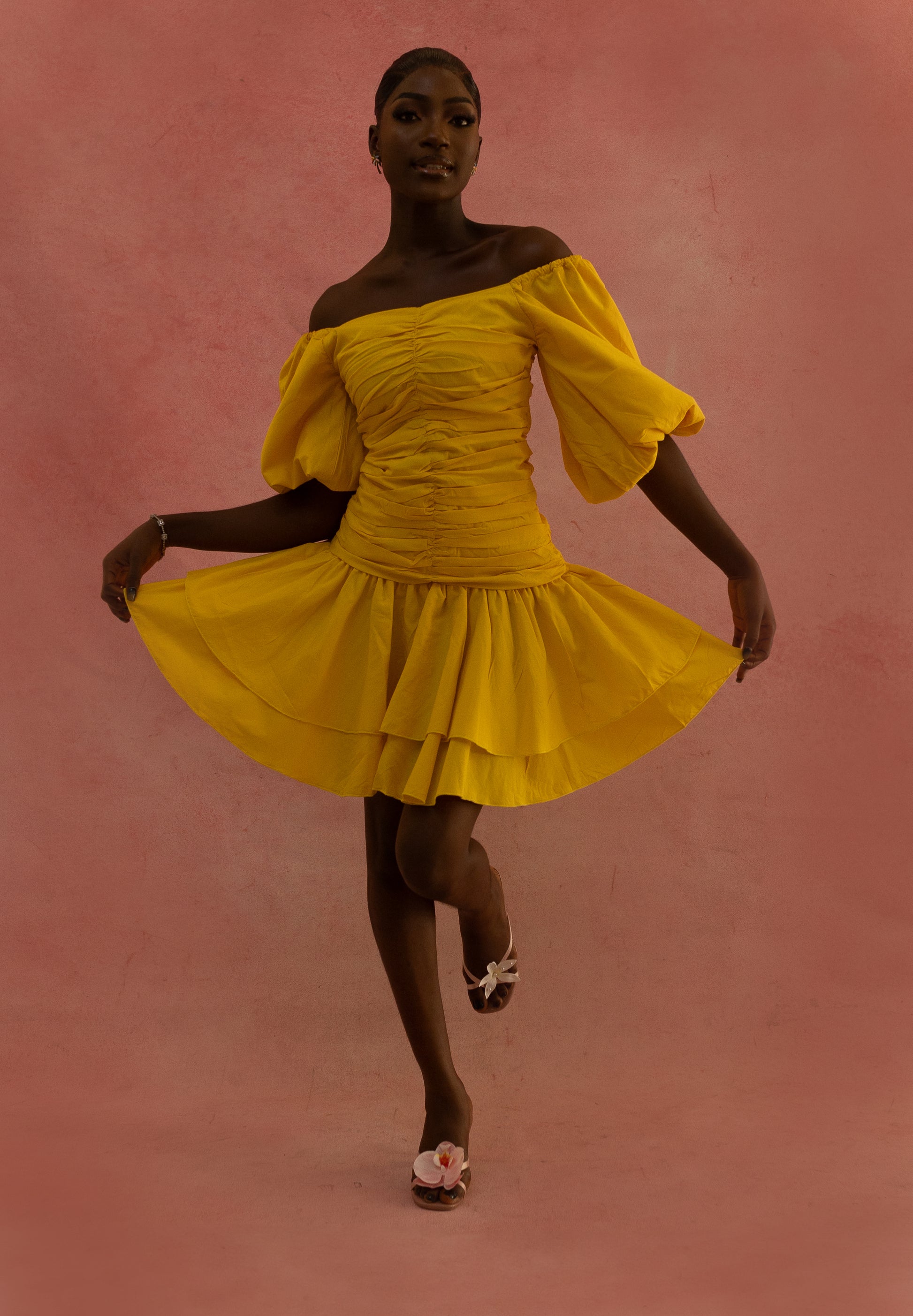 Ama, the cutest two piece in vibrant yellow . Designed for the heat, this special piece brings all the ease. Top can be worn on or off-the-shoulder , in your special way